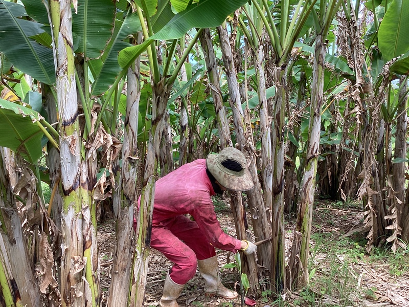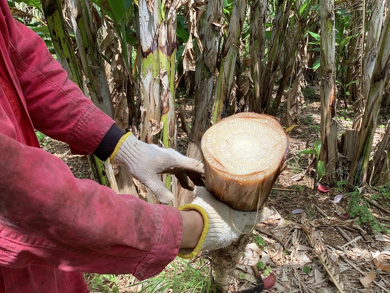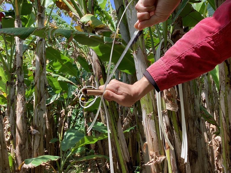 糸芭蕉の幹(偽茎)から、何層にも重なった皮を一枚一枚剥がし、竹で作った道具に挟んで繊維だけを採り出します。