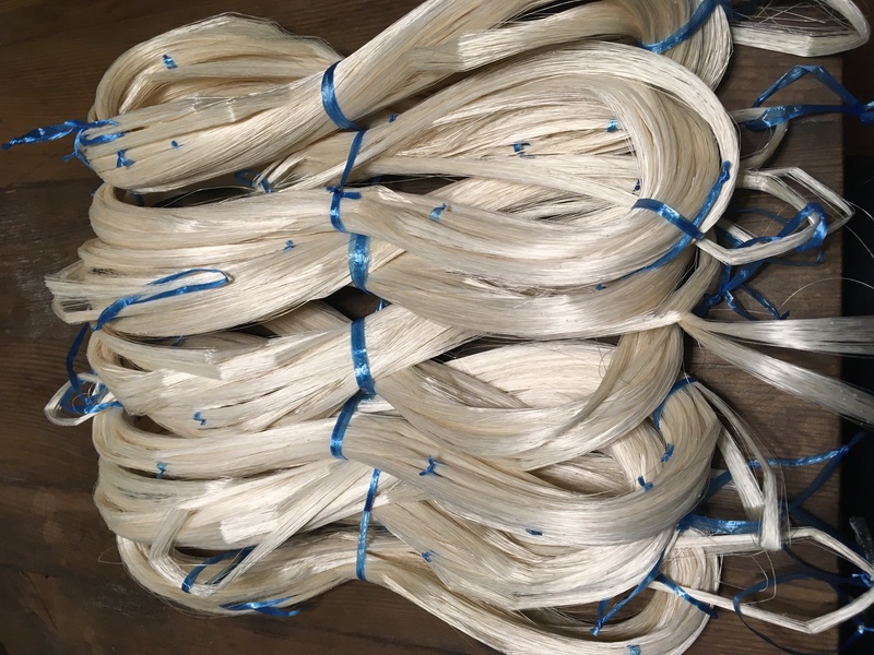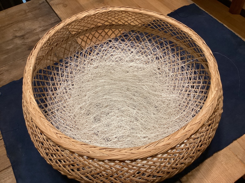 採り出した繊維を必要な太さに割き、結ぶ工程を繰り返しながら、一本の長い糸にしていきます。