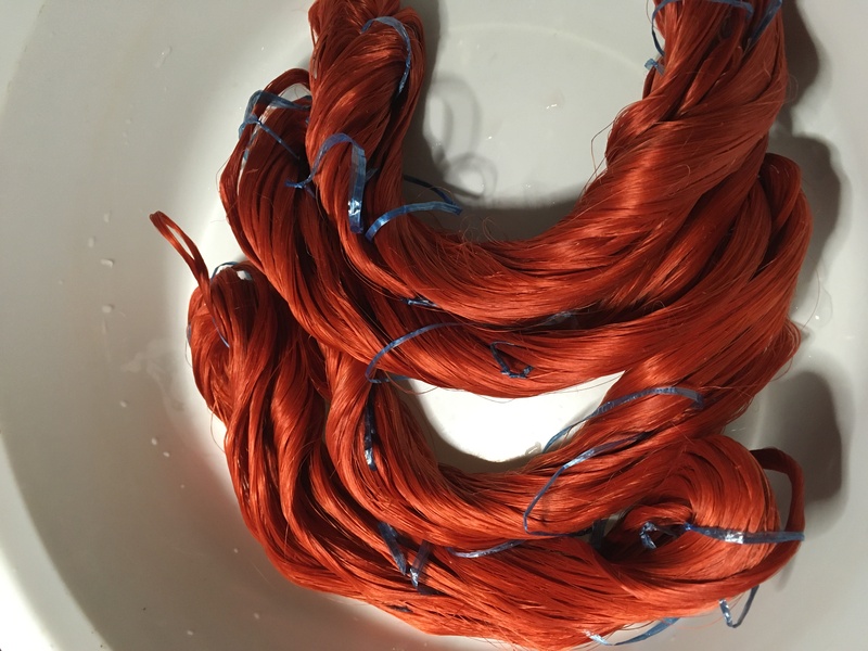 糸を綛(一定の長さを輪にして束ねたもの)にし、灰汁で煮ます。