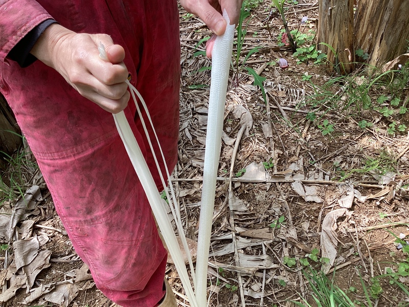 糸芭蕉の幹(偽茎)から、何層にも重なった皮を一枚一枚剥がし、竹で作った道具に挟んで繊維だけを採り出します。
